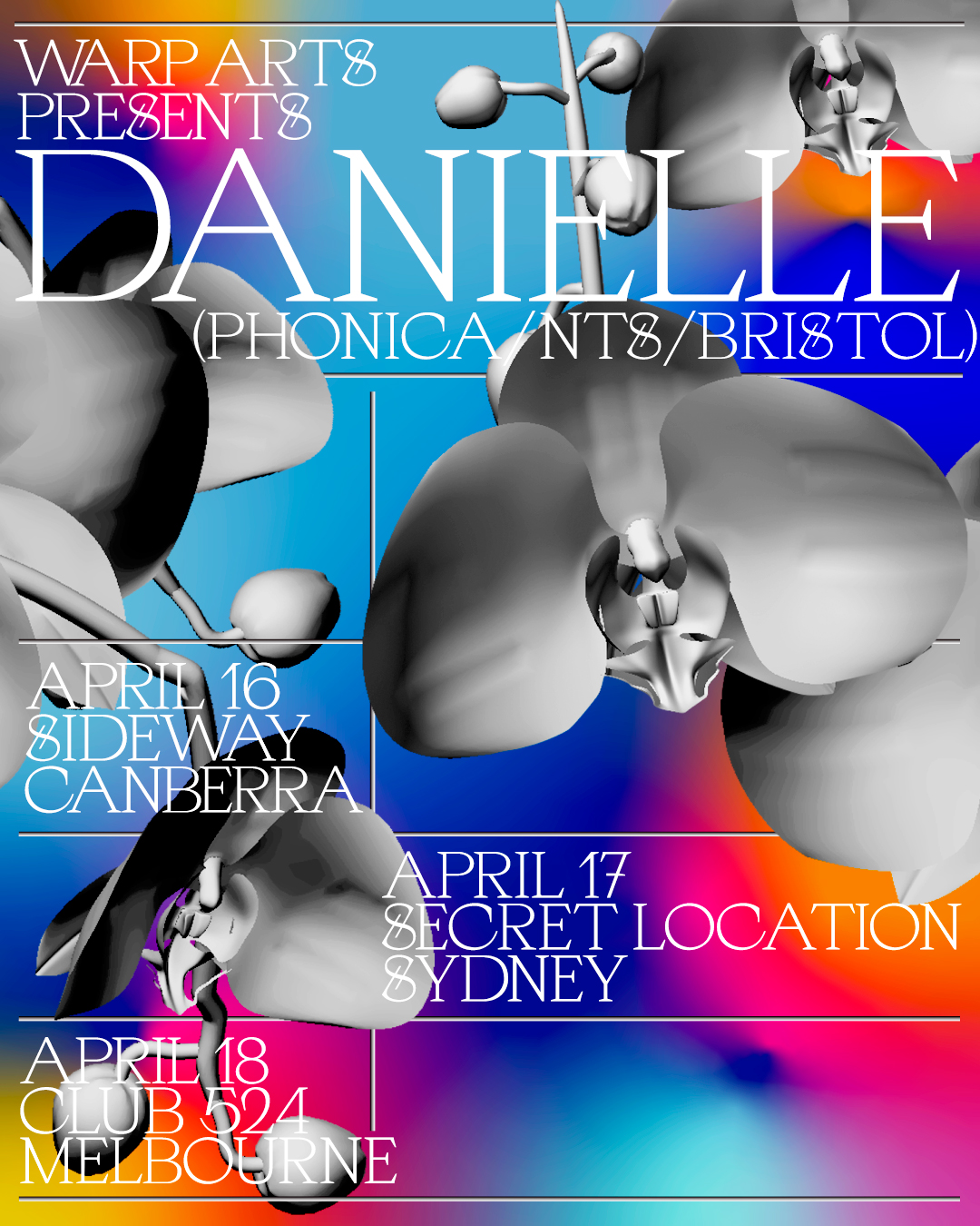 Artwork for UK based DJ Danielle’s 2020 Australian tour. This event was cancelled due to COVID-19.